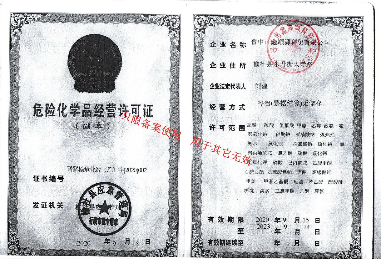 晋中市鑫顺源科贸有限公司成立于2012年9月4日,位于榆社县东大街大寺路,有安监局颁发的中华人民共和国危险化学品经营许可证和非药品类易制毒化学品经营备案证明,主要经营盐酸、次氯酸钠、液碱、片碱、纯碱、硫酸、聚合氯化铝、氯化钙、氯化钡、氯乙酸、氨水、水处理剂等危险化学品的销售及运输。
